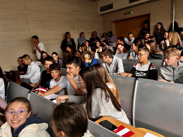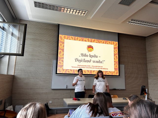 No, to nije bio kraj! Nekolicina osmaša, zajedno sa svojom učiteljicom njemačkog jezika, poslijepodne je vlakom otputovala na Filozofski fakultet u Zagrebu, gdje se već treću godinu zaredom održava Festival jezika. U bogatom programu sudjeluju veleposlanstva, kulturni instituti, fakultetski odsjeci, srednje škole, prevoditelji, književnici i brojni drugi gosti. Naši osmaši obišli su štandove kulturnih instituta okupljenih u mreži EUNIC, sudjelovali u kvizu „Bilo kuda-Dojčland svuda“ (i osvojili zanimljive nagrade), s ponosom, samouvjereno i s veseljem prezentirali svoje u školi stečeno znanje njemačkog jezika  na kratkom tečaju njemačkog jezika te pohađali kratki tečaj portugalskog jezika.