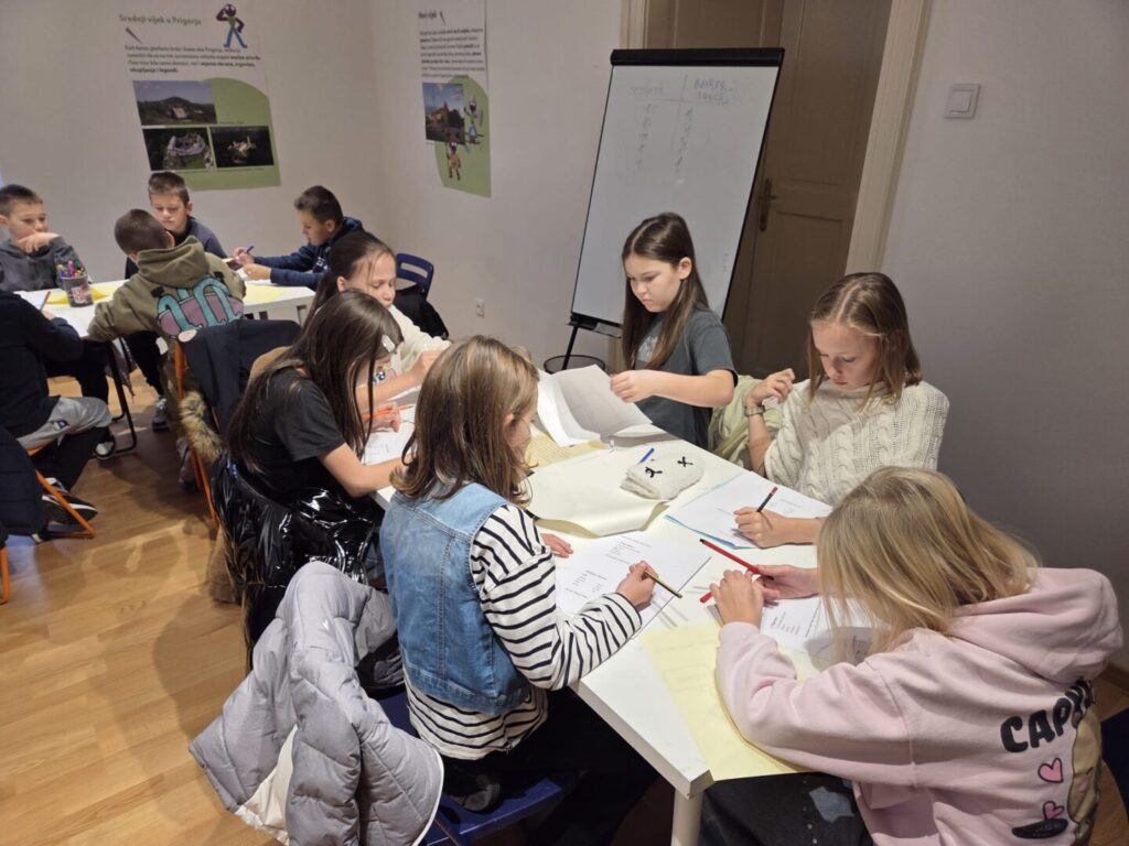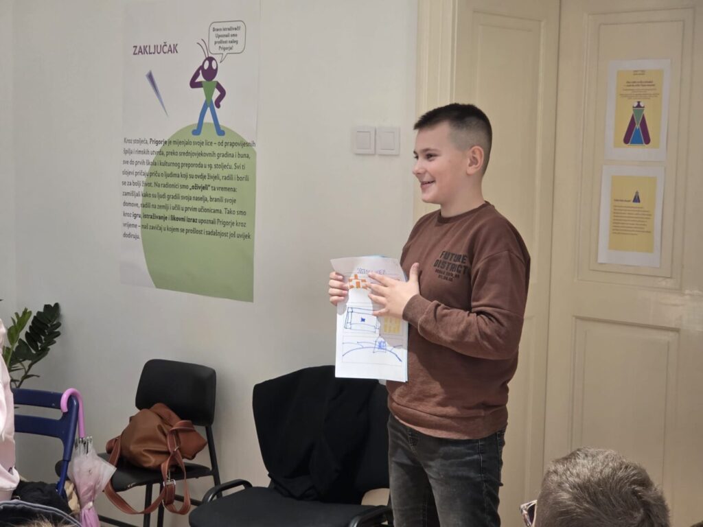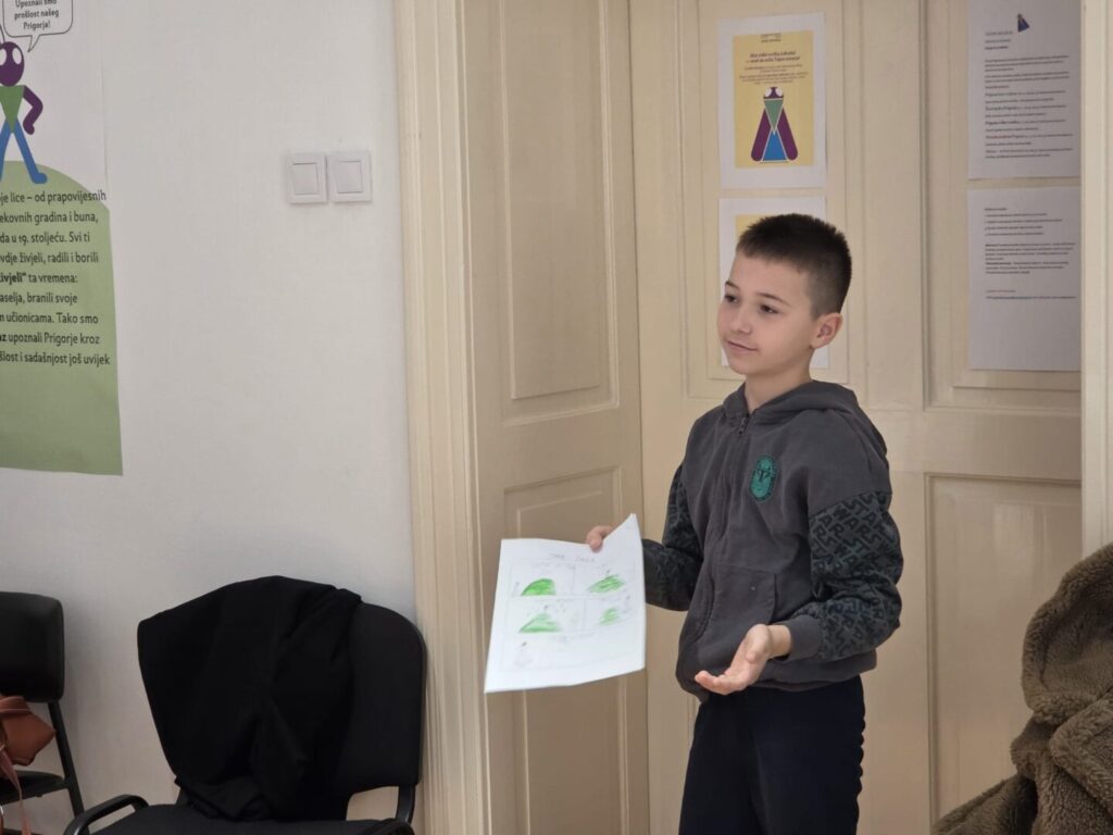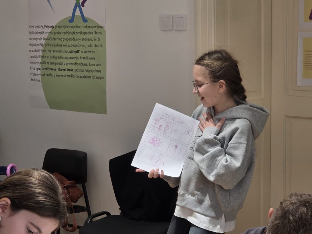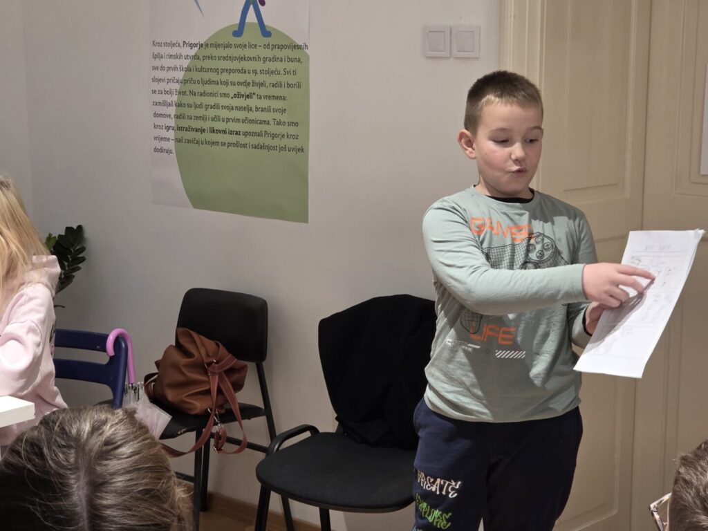 Radionicu je vodila Sanela Đurinec Raič. Radionica je bila zabavna i poučna. Počeli smo sa „postajom“ Prapovijest u Prigorju, zatim smo nastavili na Rimsko doba u Prigorju, pa srednji vijek u Prigorju i na kraju smo razgovarali o Novom vijeku. Na svakoj postaji naučili smo puno toga o nalazištima, predmetima koje su ljudi upotrebljavali, načinu života ljudi, a na kraju i o njihovom školovanju. Uz slike utvrda, škola i pronađenih predmeta na nalazištima vidjeli smo i neke predmete uživo. To je bilo posebno zanimljivo. Zatim smo sve ponovili na zabavan način kroz kviz i dobro se zabavili.