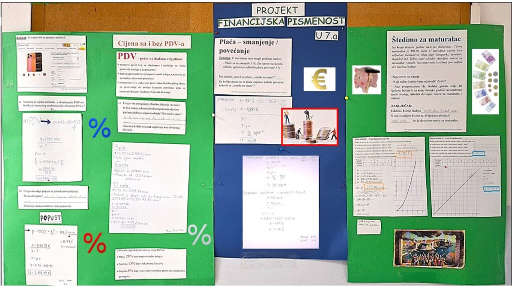 Kako bi se povećala financijska pismenost učenika i razvilo razumijevanje osnovnih financijskih pojmova, kao što su povećanje ili smanjenje plaće i cijena, štednja i porezi, učenici 7.a, podijeljeni u tri grupe, rješavali su zadatke vezane uz: