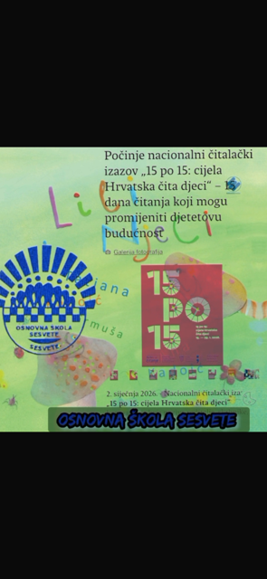 Čitanje je važno – to već svi znaju. Redovito čitanje ima brojne pozitivne učinke, stoga su se učitelji prvašića, knjižničarka te učenici sedmih i osmih razreda odlučili pridružiti nacionalnom čitalačkom izazovu „15 po 15“ kako bi potaknuli stvaranje trajne navike čitanja kod učenika.