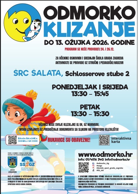 kolski sportski savez Grada Zagreba u petak 21. studenog 2025. godine kreće sa novom sezonom slobodnog klizanja na ŠRC Šalata u okviru programa Odmorko tijekom školske godine.